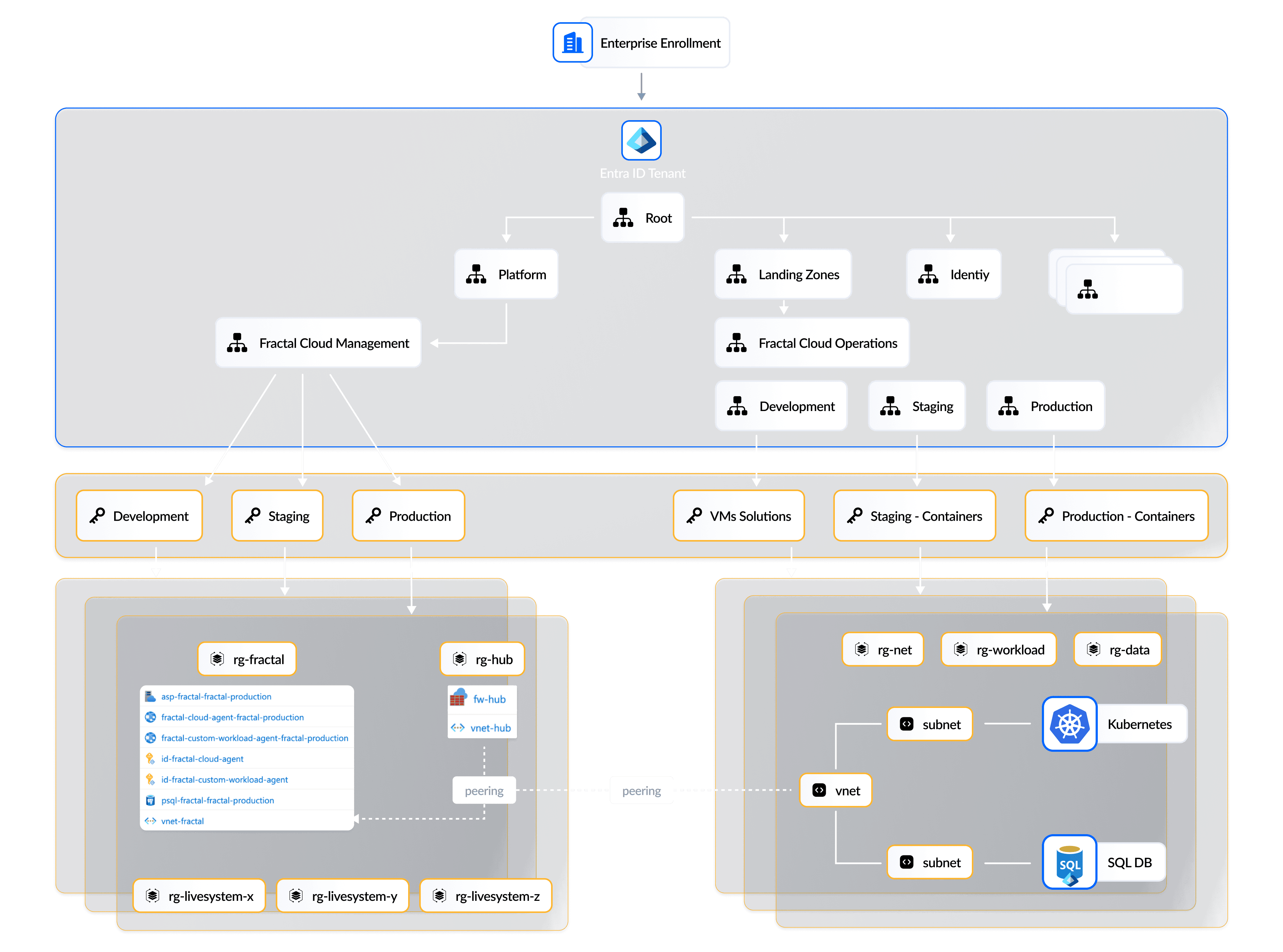The image shows a cloud architecture structured according to Microsoft Azure Cloud Adoption Framework (CAF). In traditional models, the complexity of this setup falls entirely on infrastructure and platform teams. Fractal Cloud removes this burden by automating security, governance, and environment configuration requirements following the Cloud Vendor best practices, in this specific example the Azure CAF, without asking the CoEs or the Development Teams to write a single extra line of Infrastructure as Code (IaC). Although the example is based on Azure, the same approach applies to AWS, GCP, and OCI, thanks to the cloud-agnostic nature of the Fractal Architecture model, Fractal Cloud implements transparently the Well-Architected Framework, the Google CAF, and Oracle CAF respectively.